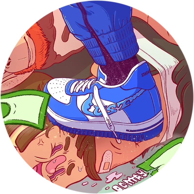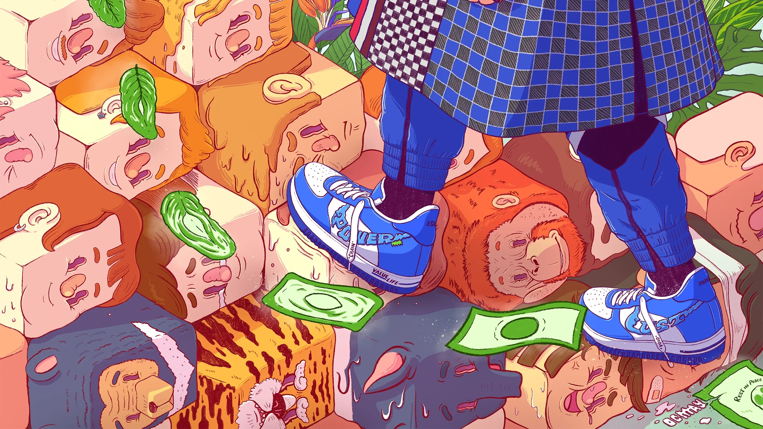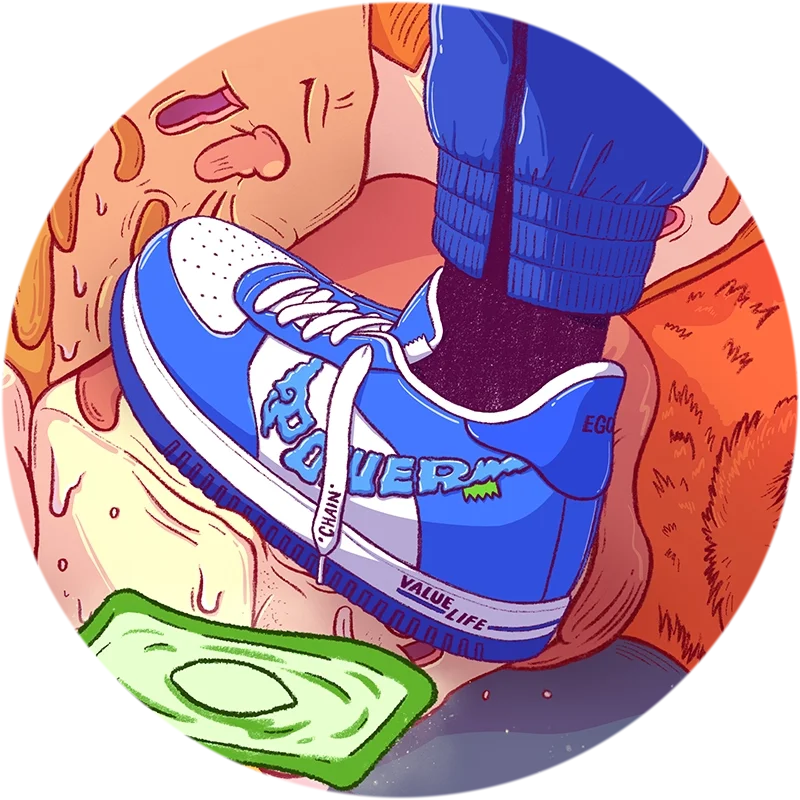 The figure wears luxury sneakers marked with “Lust” and “Power”, and small words, “Status,” “Ego,” “Life,” “Value” , “Chain”, “Void”, written across the shoes.