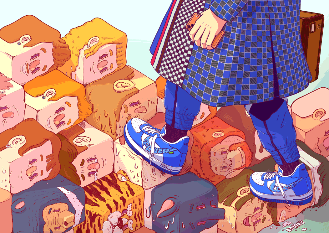 這幅超現實插畫描繪一個人走在由人與動物頭顱構成的階梯上,
