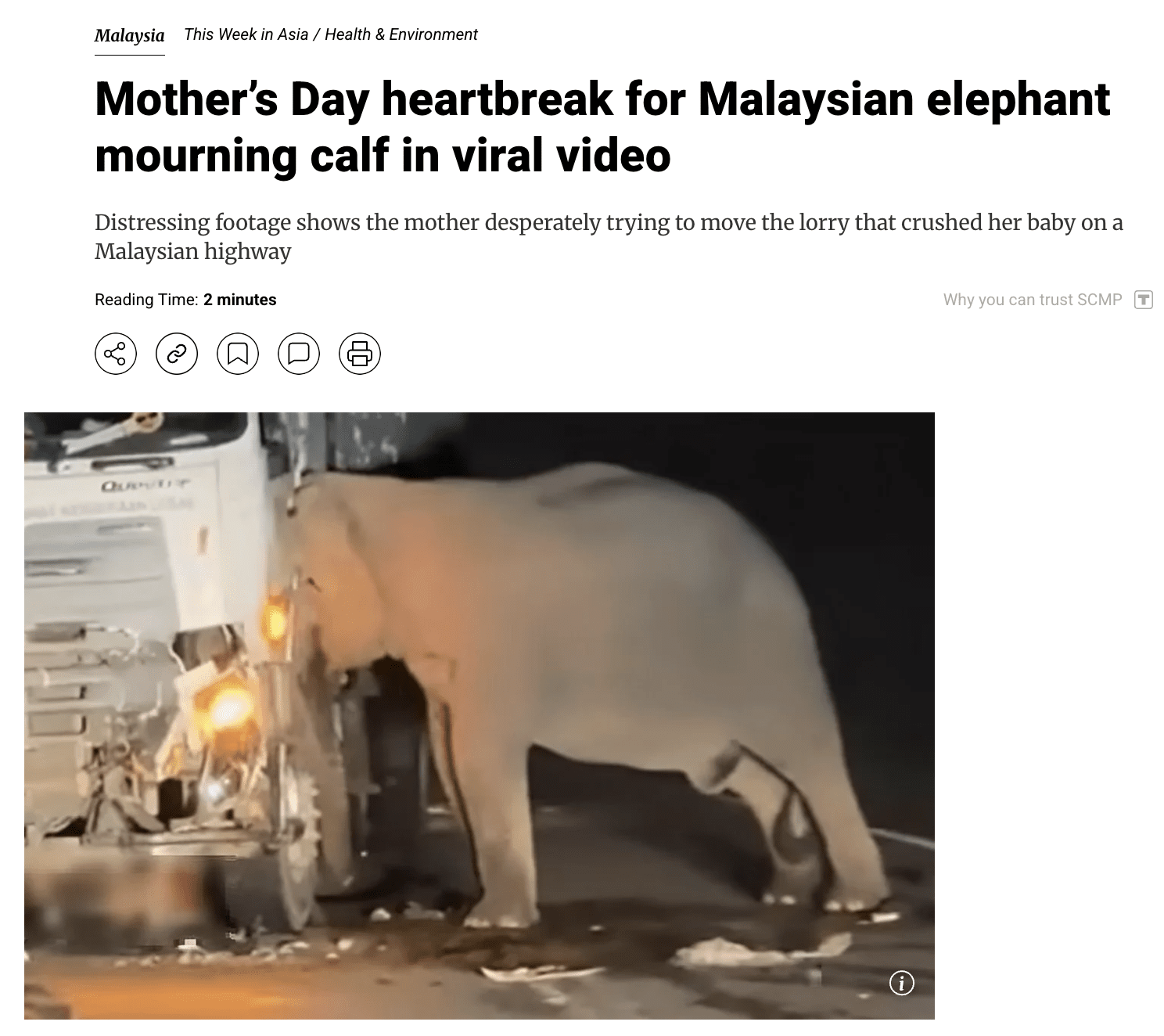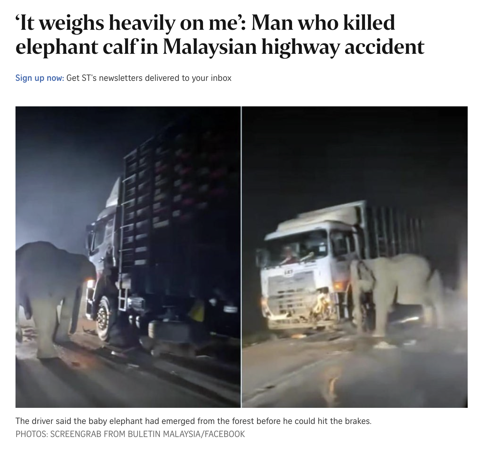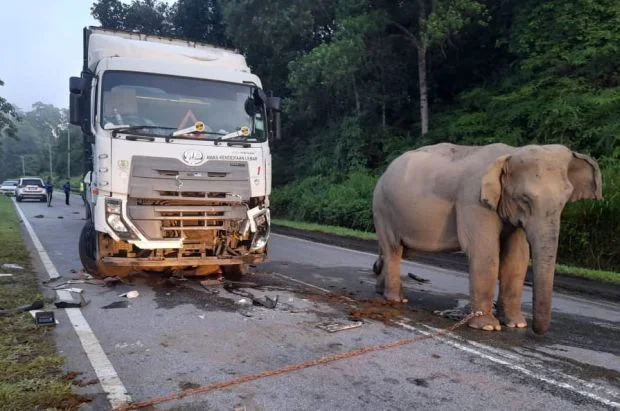 馬來西亞一頭年幼小象在Belum-Temenggor 森林保護區附近橫越公路時,被一輛大卡車撞死。