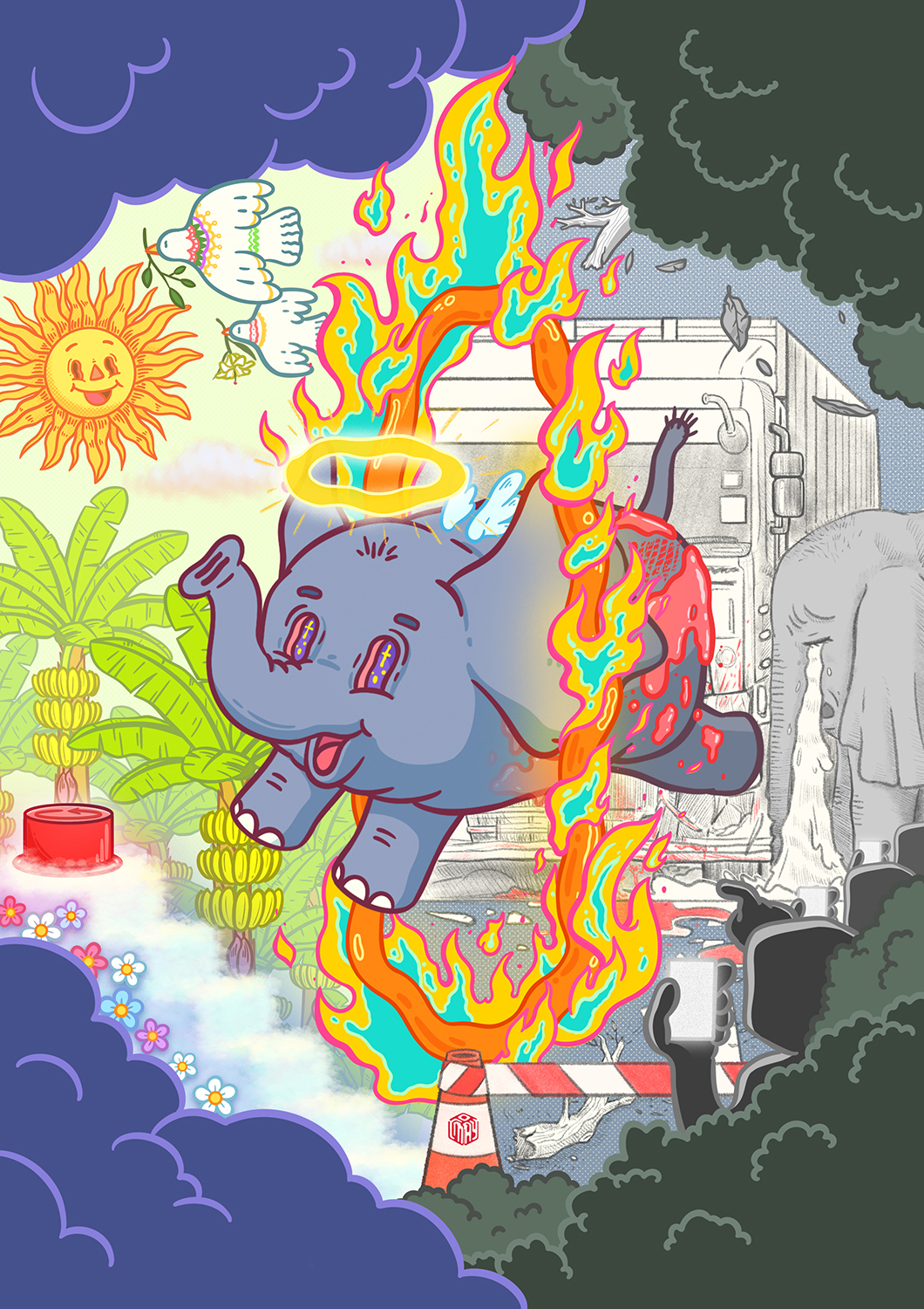 The little elephant passes through a ring of fire, walking toward light, peace, and rebirth.