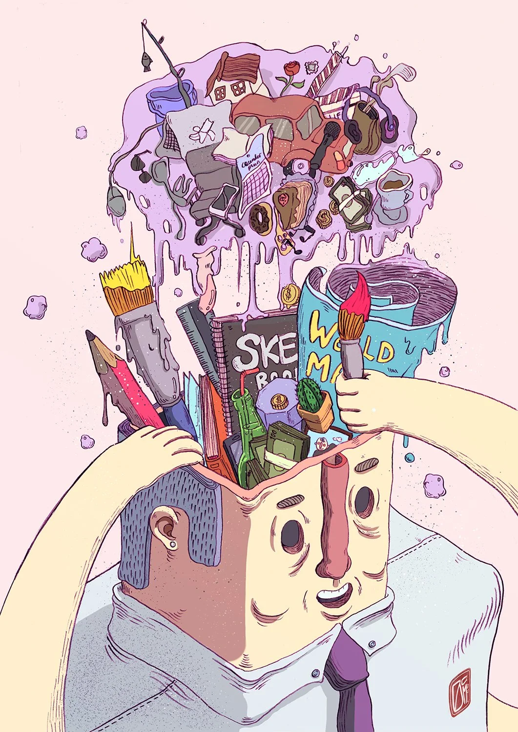 A floating figure removes a fake mask while pulling out drawing tools from their heart, a metaphor for embracing authenticity and creative courage. Again, a reminder: take action, not just dream.